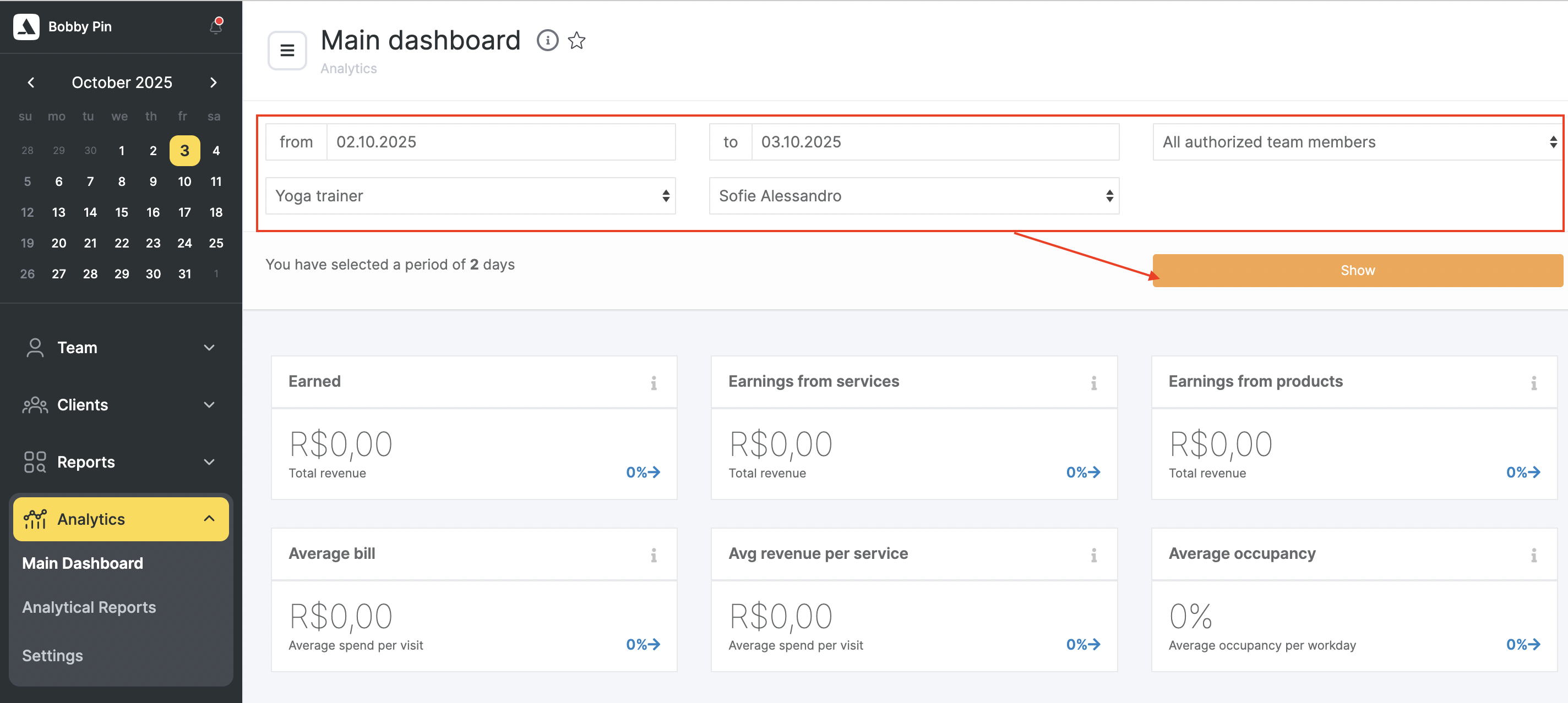 To generate a report, go to the Analytics > Main Dashboard section. Filter the list by the required items and click the Show button.