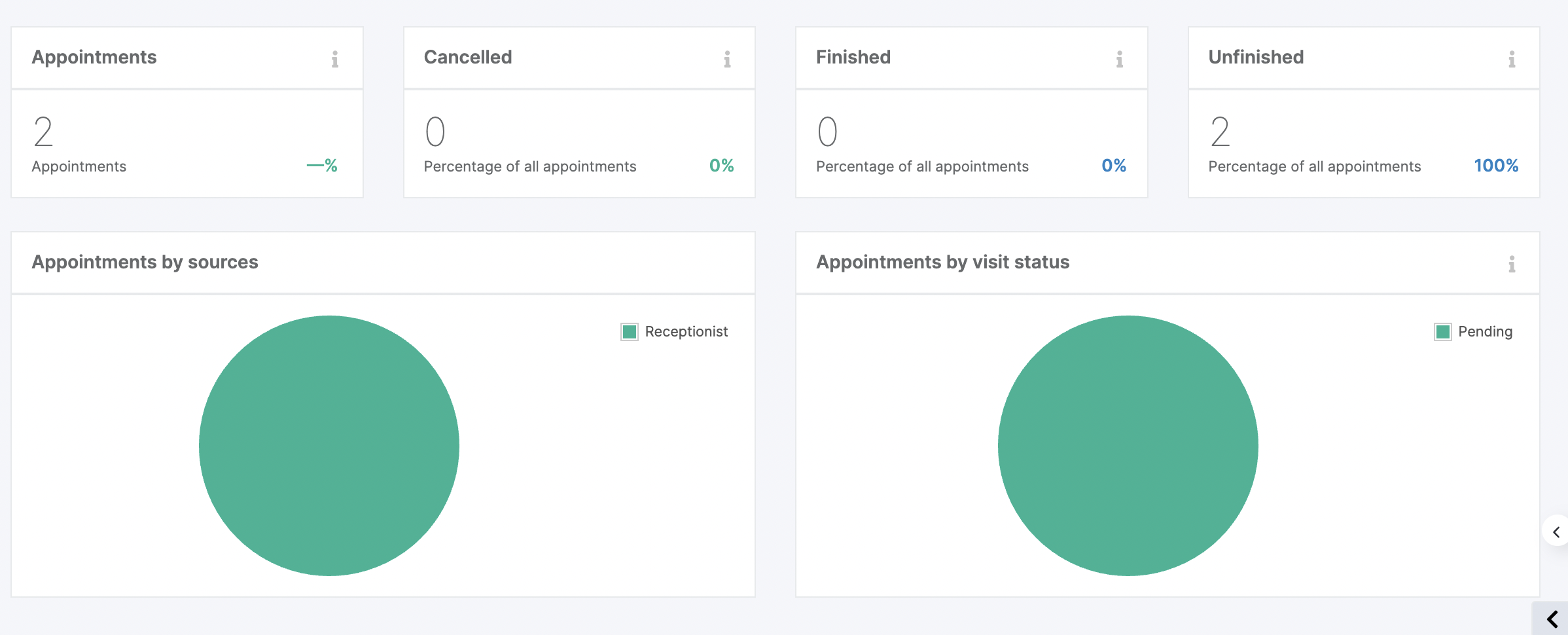 - Appointments and visits (visit status, booking sources).