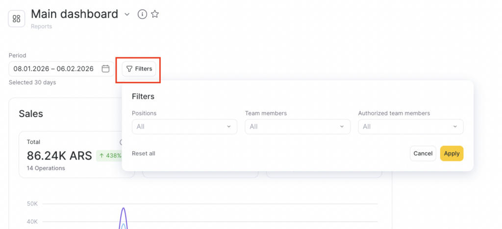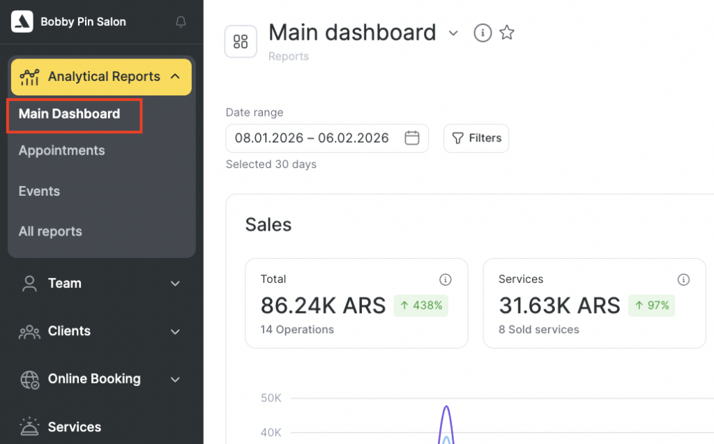 - Clients — number of unique clients who visited during the selected period. If the same client visited multiple times or booked with different team members, they are counted only once.