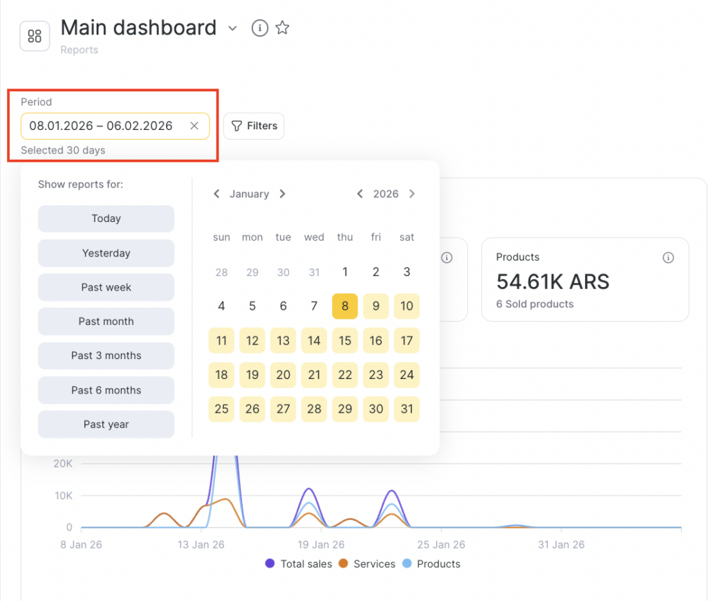 - Products — revenue from product sales. Includes the value of products sold during visits with the status “Arrived”, plus product sales outside a visit.