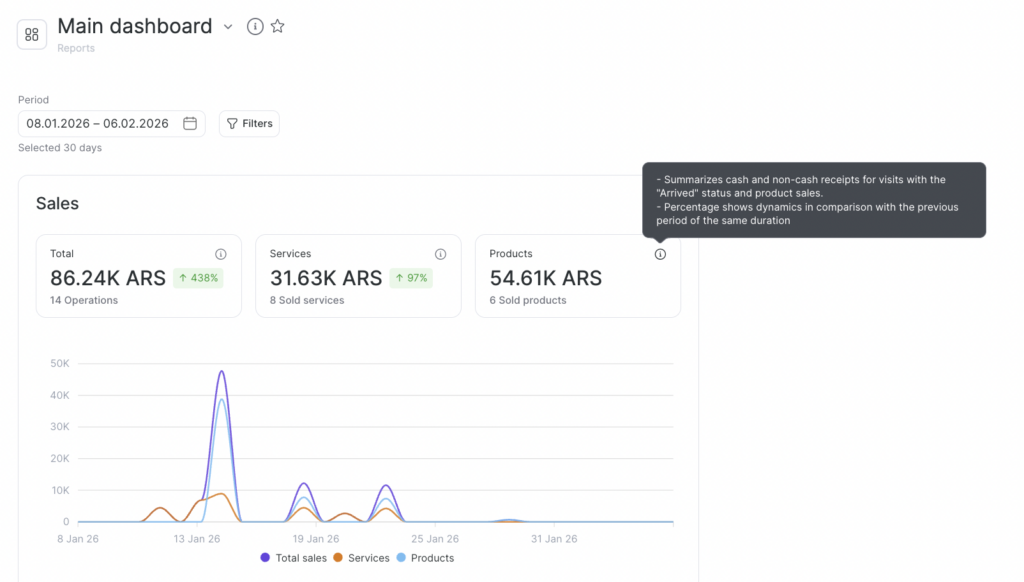 - Services — revenue from provided services. Includes cash and cashless payments for visits with the status “Arrived.”