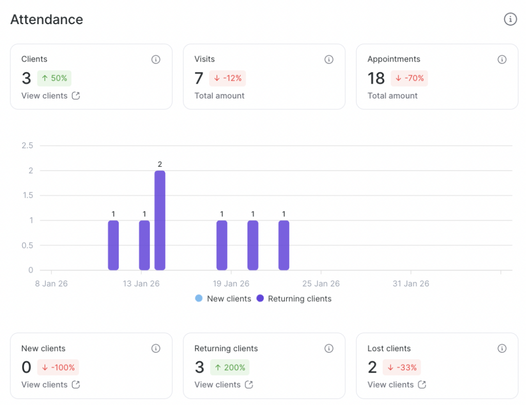 The Attendance section reflects client activity during the selected period and helps you track visit dynamics and changes in your client base.