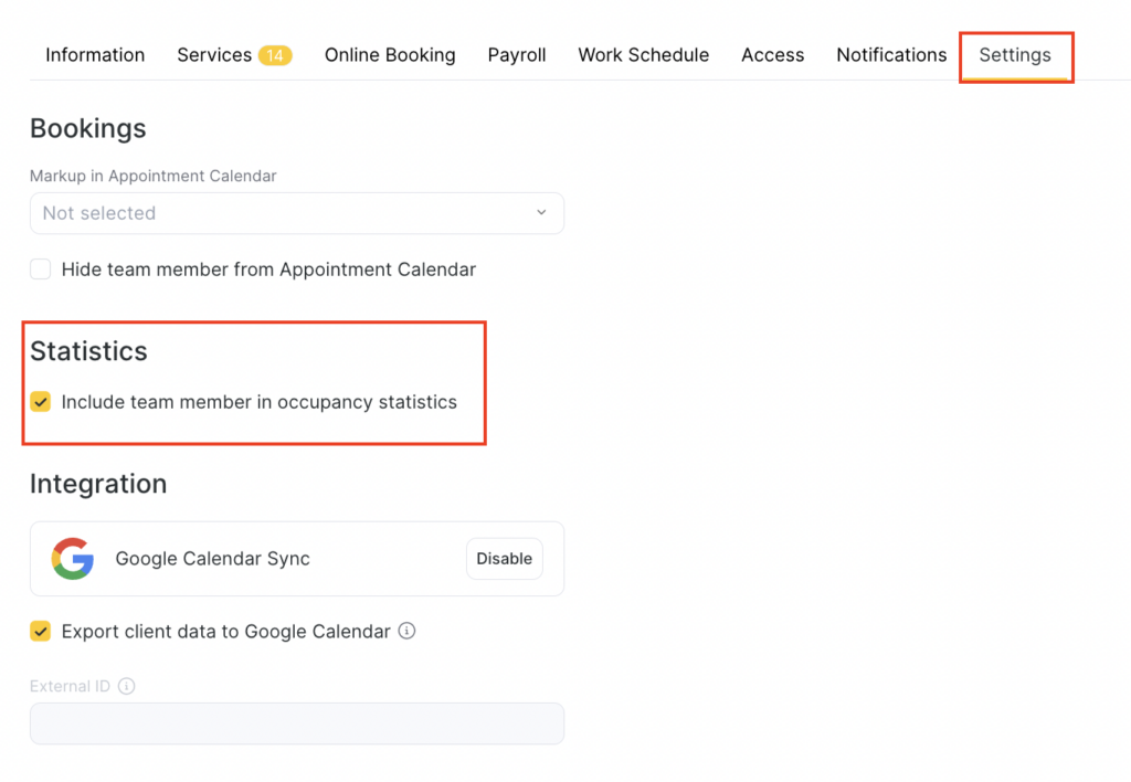 Statistics > Include team member in occupancy statistics (see the Statistics section of the related article).
