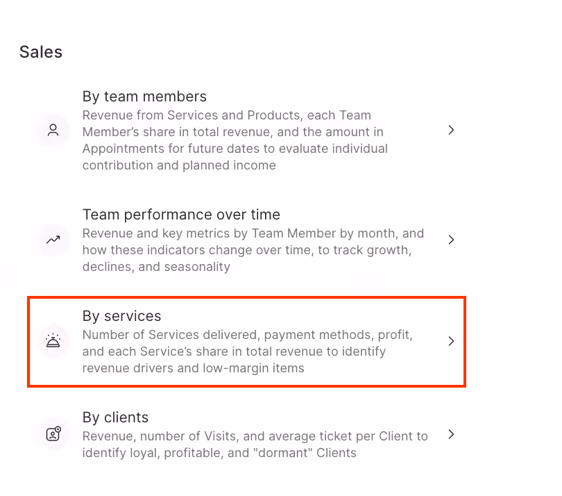 The Analytical Reports > All reports > Sales > By services section displays statistics on all services provided for a certain period. This section helps to analyze which service is more in-demand and produces more revenue, and which one does not make a profit for the company, therefore, it can be removed or timely measures can be taken.