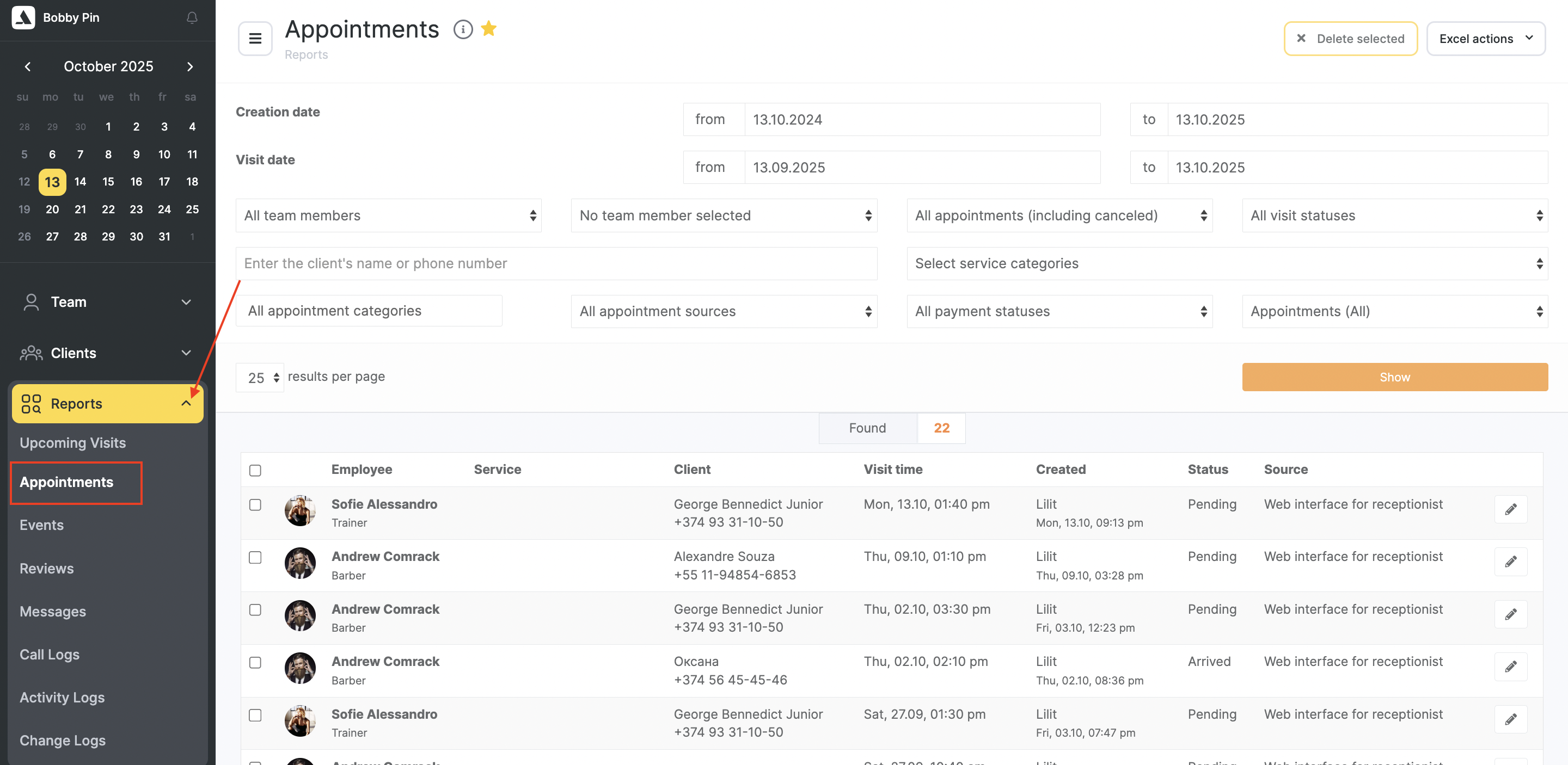 In the Reports > Appointments section, you can find information on all appointments made in Altegio to your company. This includes appointments from any source, created by any user with the right to create an appointment, with any status, including deleted ones.