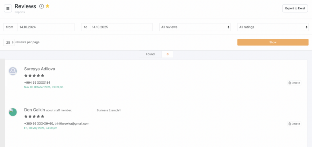 Filter the list by the required items and click Show. Beyond that, the reviews can be deleted in this section.