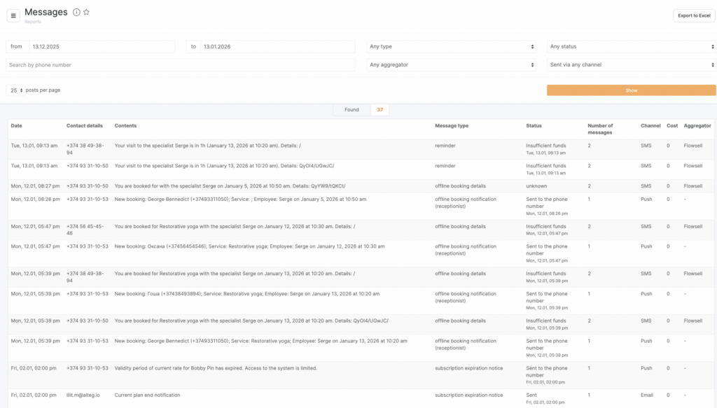 Filter the list by the required items and click Show. Beyond that, you can see SMS notifications sent to a certain number, to do this, enter the phone number in the search field and click Show.