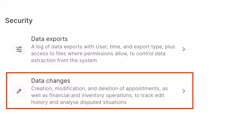 The Analytical Reports > Data changes section contains information about all actions (adding, changing, deleting) with appointments, financial and inventory operations that were made in Altegio.