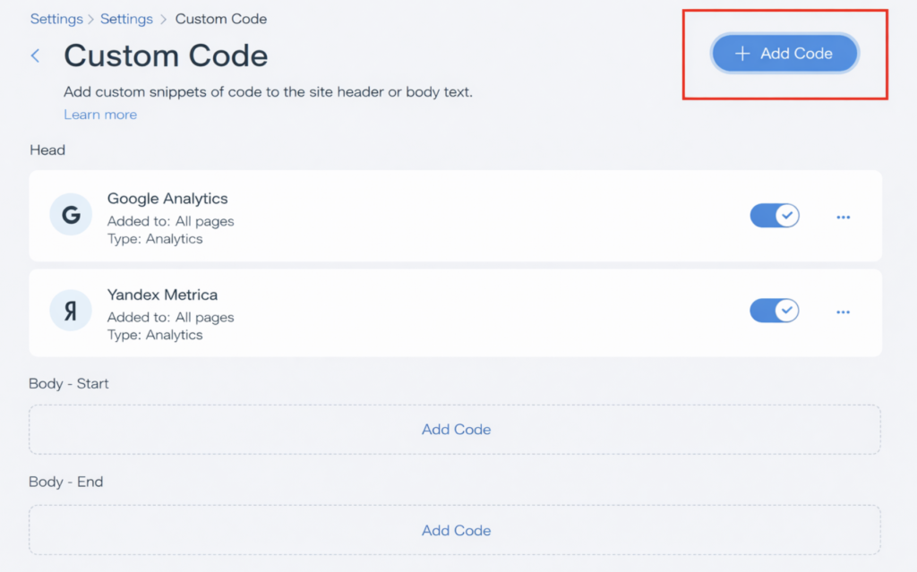 - Open the site editing mode. In the top menu, select Settings > Analytics codes. Click + New Tool, and in the dropdown menu select New code.