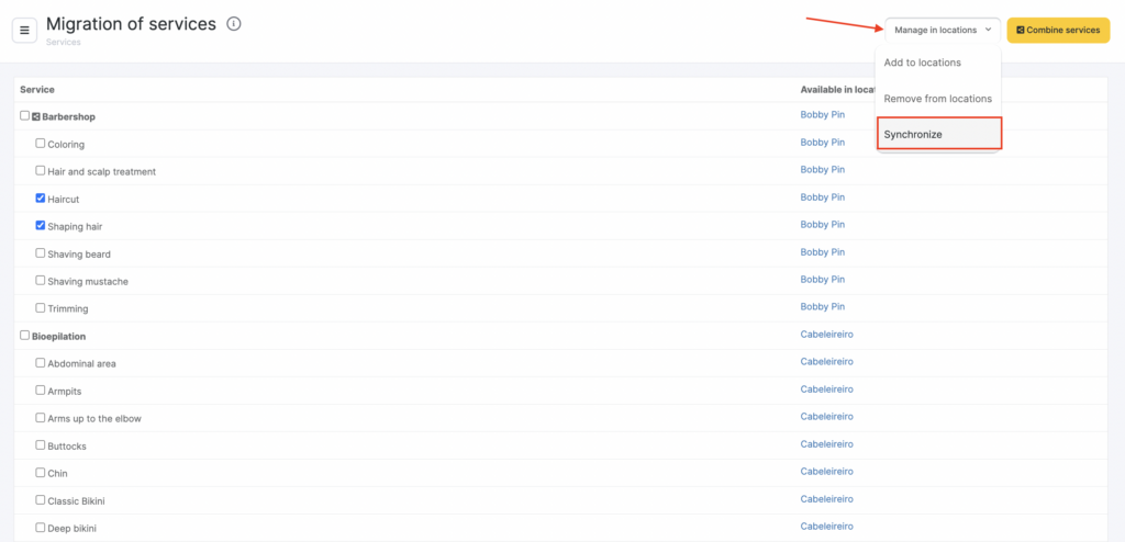 The list of services from all locations, as well as all chain services are displayed in the Services > Merge Services section. Next to each service, there is information about the location where it is available. Chain services are managed using the buttons in the upper right corner: Manage in locations and Combine services.