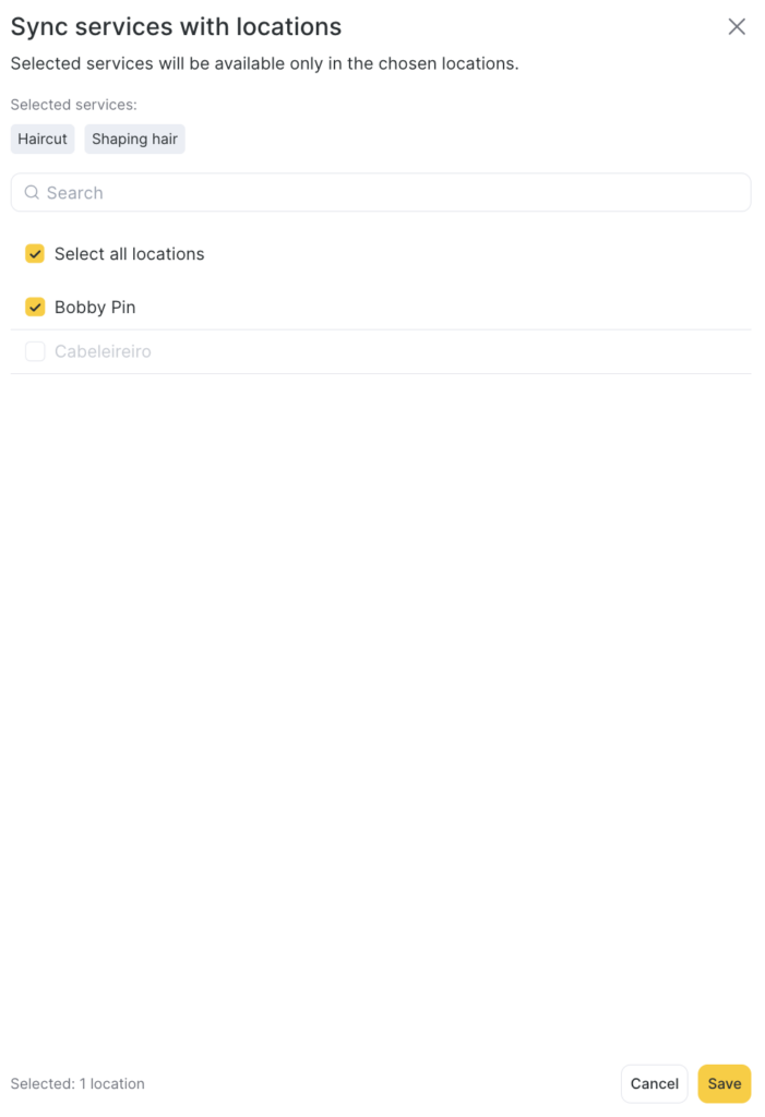 - Copy the services from the newly created chain category to other locations. In a similar way to the category setting, check the boxes on the left of the service name and click Manage in locations. In the pop-up window select the locations (check the boxes) where you want to copy the services to.