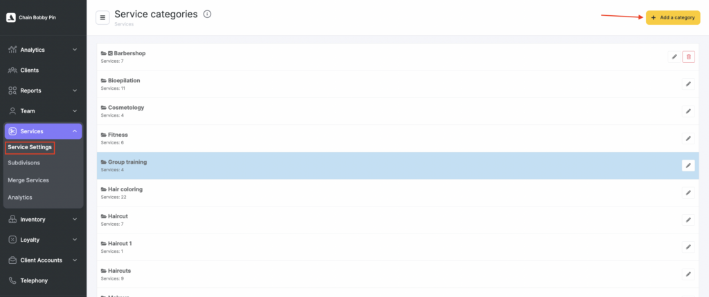 Go to Services > Service Settings. Here you can add a service category and create services within this category. A category created in this section will be a chain category.