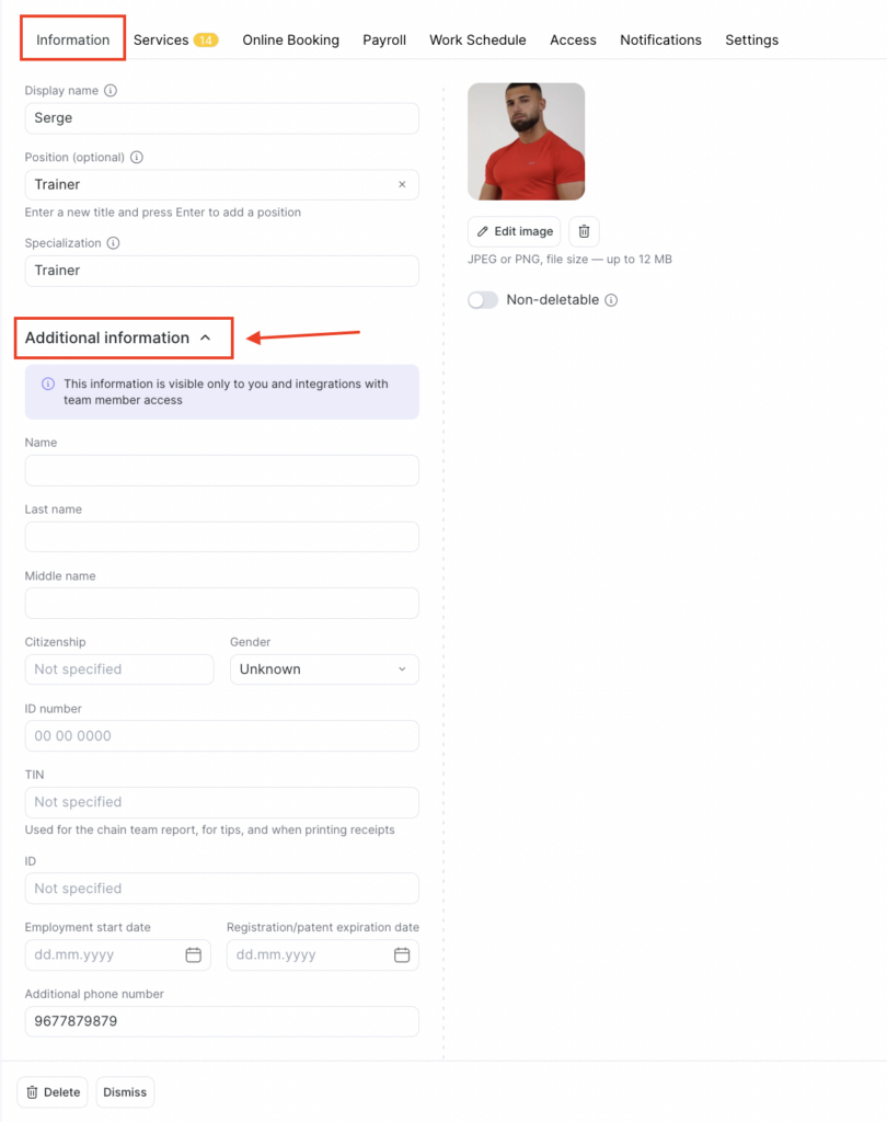 - In the new window that opens, fill in the team member’s basic and additional information (for details, see the articles Adding team members and Additional team member information).