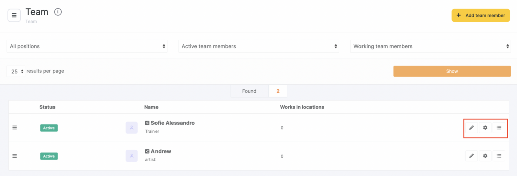 You can also edit team member data after creation using the buttons to the right of the team member: