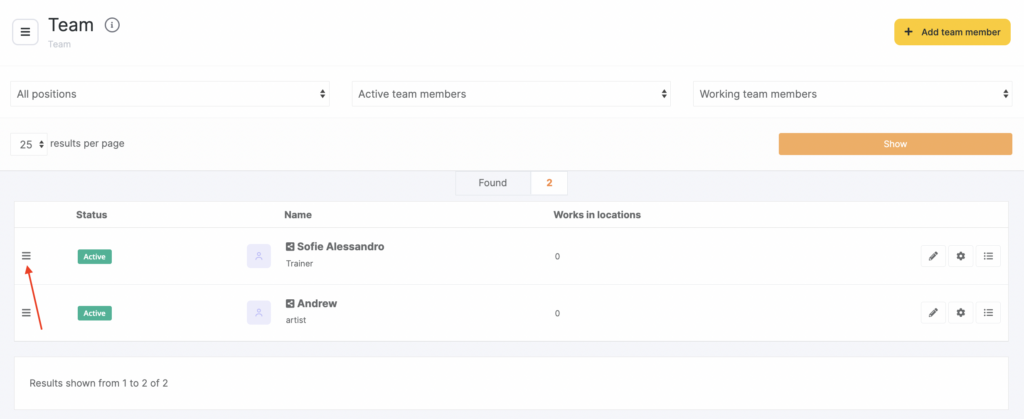 You can rearrange team members in the list. To do this, click the three-line icon to the left of a team member and drag the row to the desired position. This order is displayed in the appointment calendar and the online booking widget.