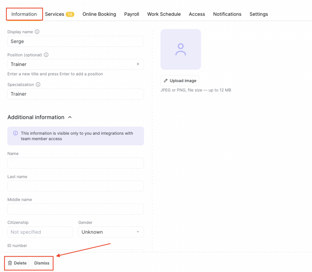- On the Information tab select the Dismissed status and set the dismissal date if you want to remove the team member from the list while keeping all their statistics.
