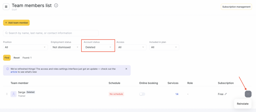 Dismissed and deleted team members can be restored.