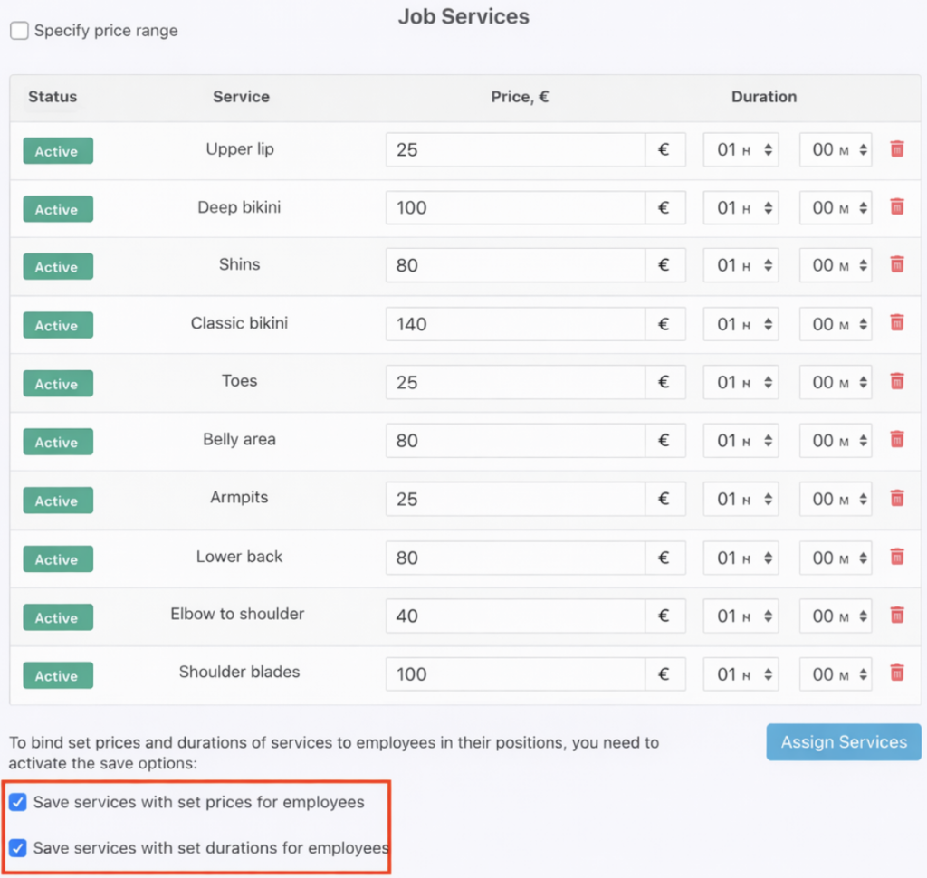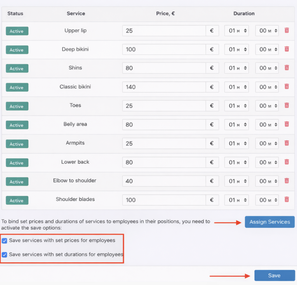 - If necessary, also specify the duration of the services provided. To automatically set the duration in the team member settings for the newly created position, check the box next to “Save services with price and duration settings for team members.”