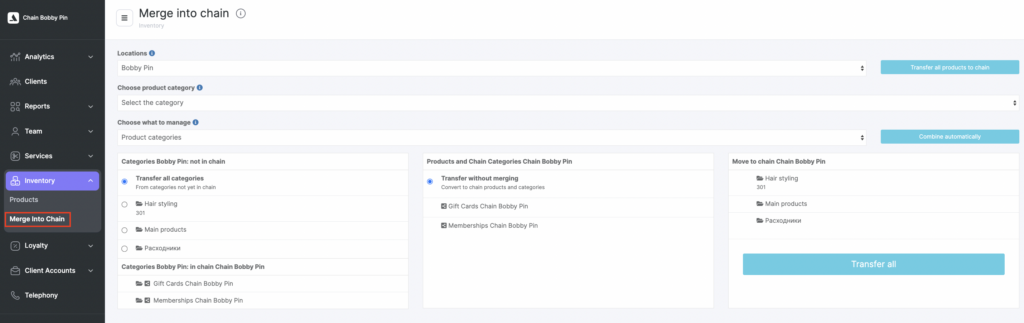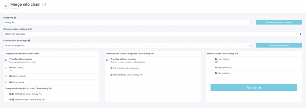 You can also transfer products from the location to the chain on a mass scale. To do this, go to the Inventory > Merge into chain section, select the location where you want to transfer the products from, and click Transfer all products to the chain.