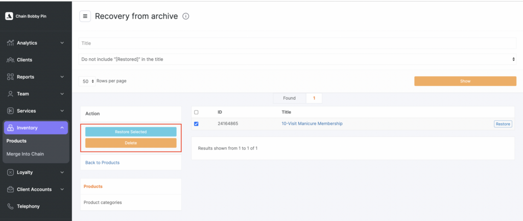 - To restore or delete an archived product, go to the Inventory > Products > Product Archive section in the chain interface.