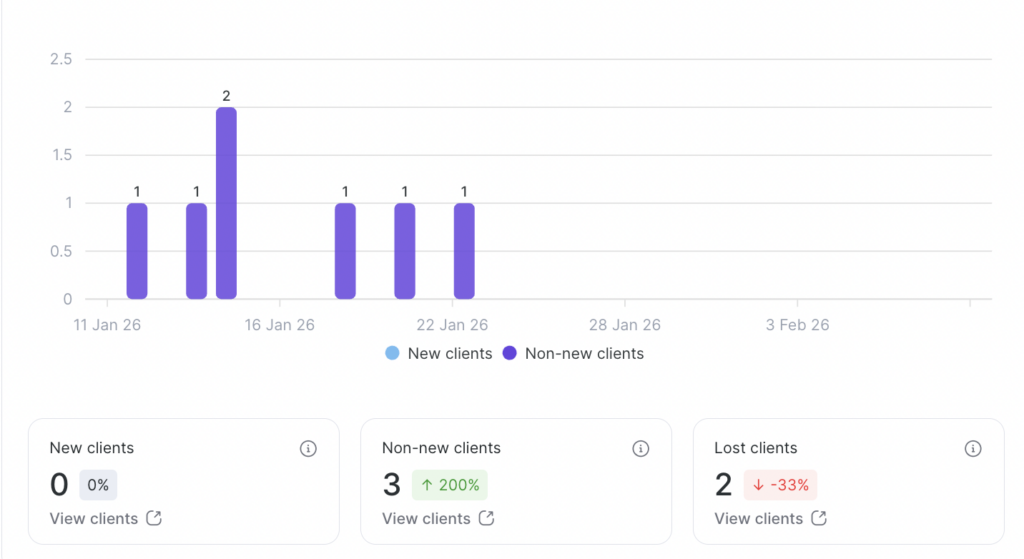 - Lost clients. Shows how many clients had their last visit within a period equal in length to the selected one, and whose last visit ended the number of days specified under Analytics > Settings > Client Churn (details in the article) before the start of the selected period.