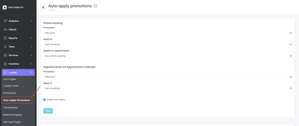 In the chain interface go to the Loyalty > Auto-Apply Promotions section.