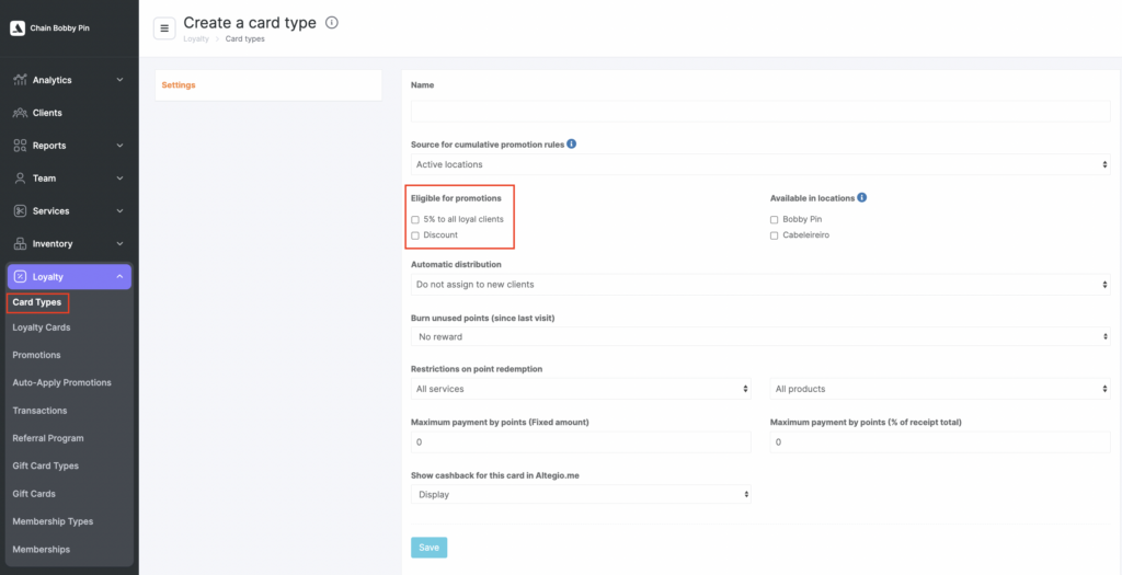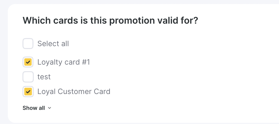 - Loyalty card — locations selected in the card type