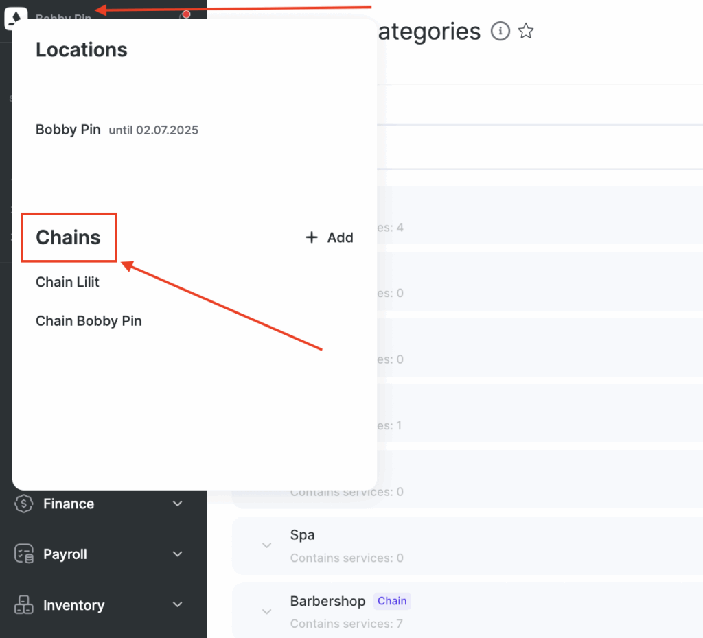 There are two types of spaces in Altegio: locations and chains. Locations — with yellow highlight, chains — with purple highlight. Locations and chains have different sections.
