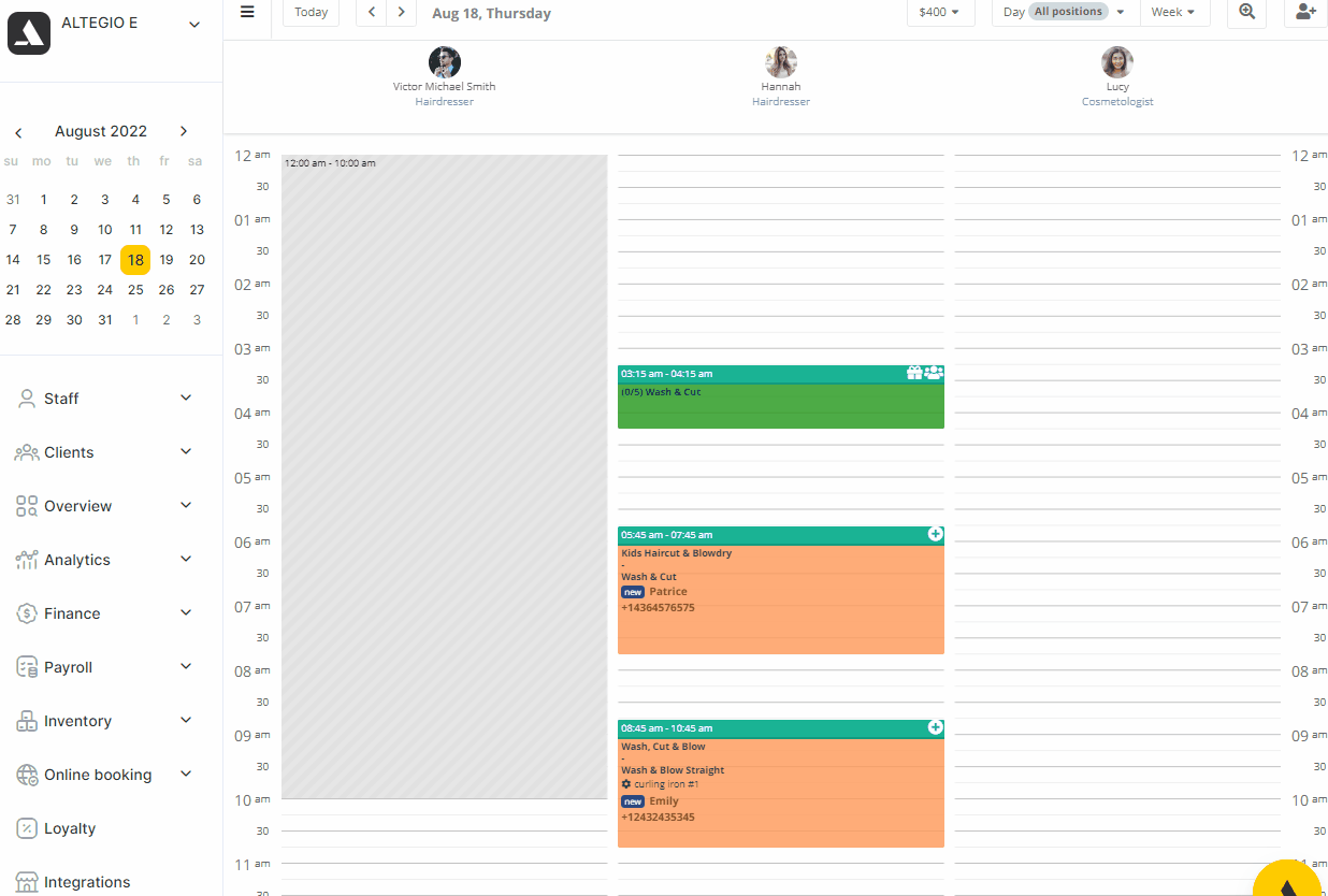 There are two types of spaces in Altegio: locations and chains. Locations — with yellow highlight on the left, chains — with purple highlight on the left. Locations and chains have different sections.