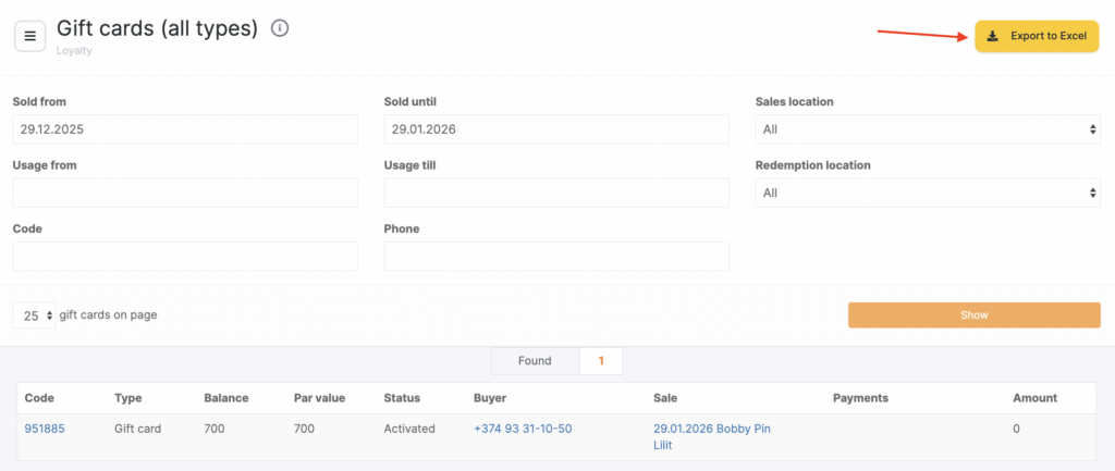 Using filters you can view a number of gift cards sold in a specific location for a period selected.