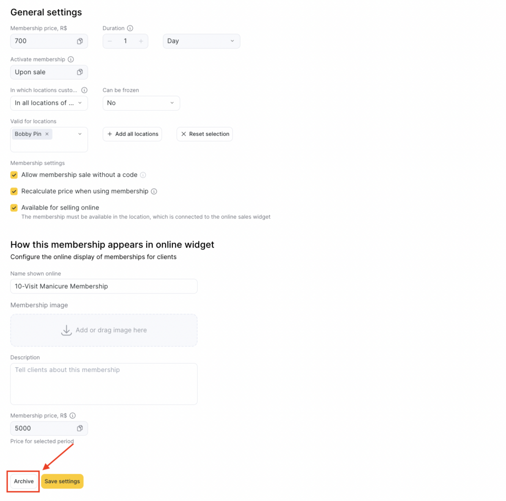 Archive button will appear only after you sell the membership at least once.You can archive any membership type, even if it was sold memberships and memberships with active balance.