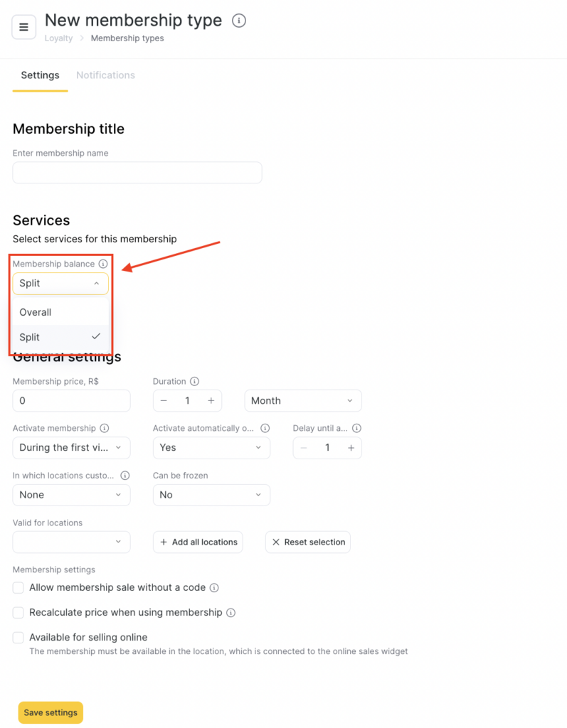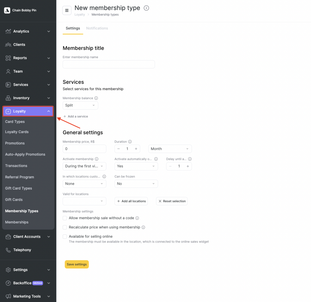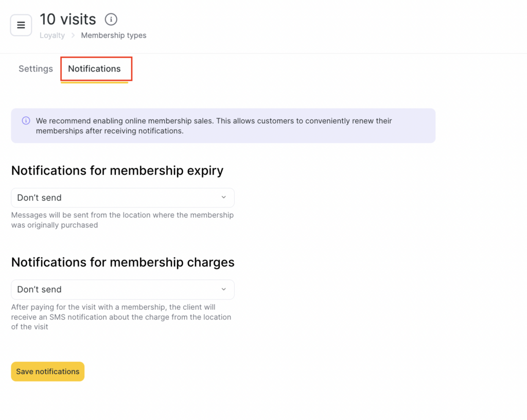 To set up notifications, go to Loyalty > Membership types in the chain interface, select the required membership type, and open the Notifications tab.