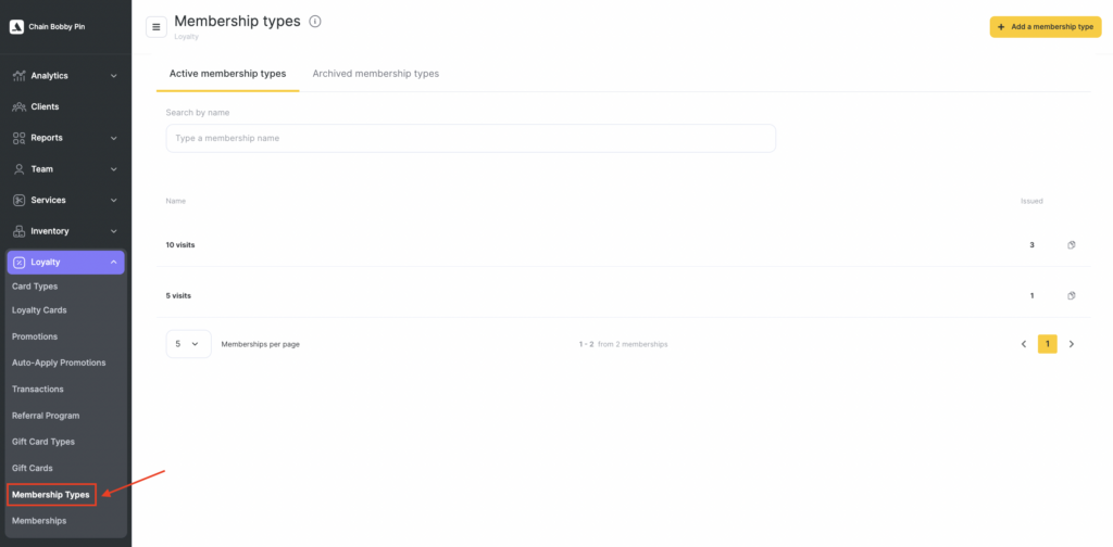 Archived membership types are moved to the Archived membership types tab. After moving, archived memberships stop appearing in the list of products during sale.