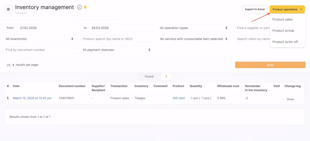 You can also create a sales transaction directly in Products > Inventory Management without using the appointment calendar. To do this, click Product Management > Product operations > Product sale in the upper-right corner.