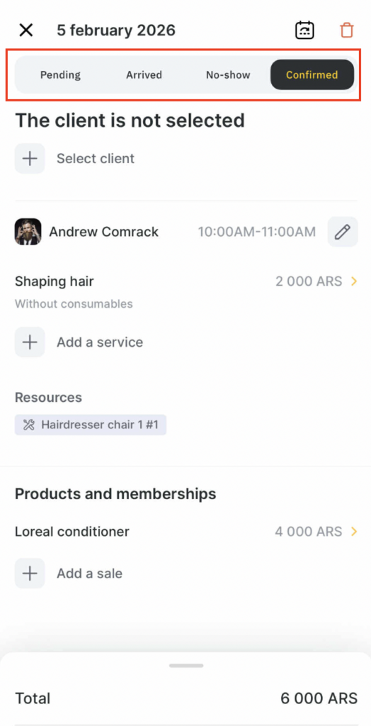 - To delete a service from the appointment, click the trash icon in the upper right corner.