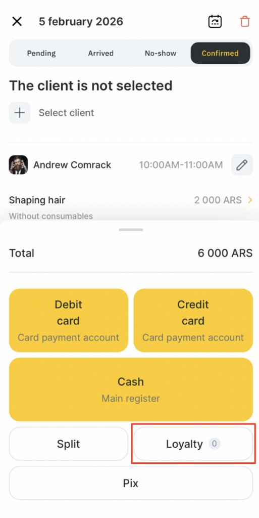 The Loyalty block displays all customer loyalty available for use in this visit. If you need to apply loyalty that is not attached to the client, use the code search (the search field in the Loyalty block).