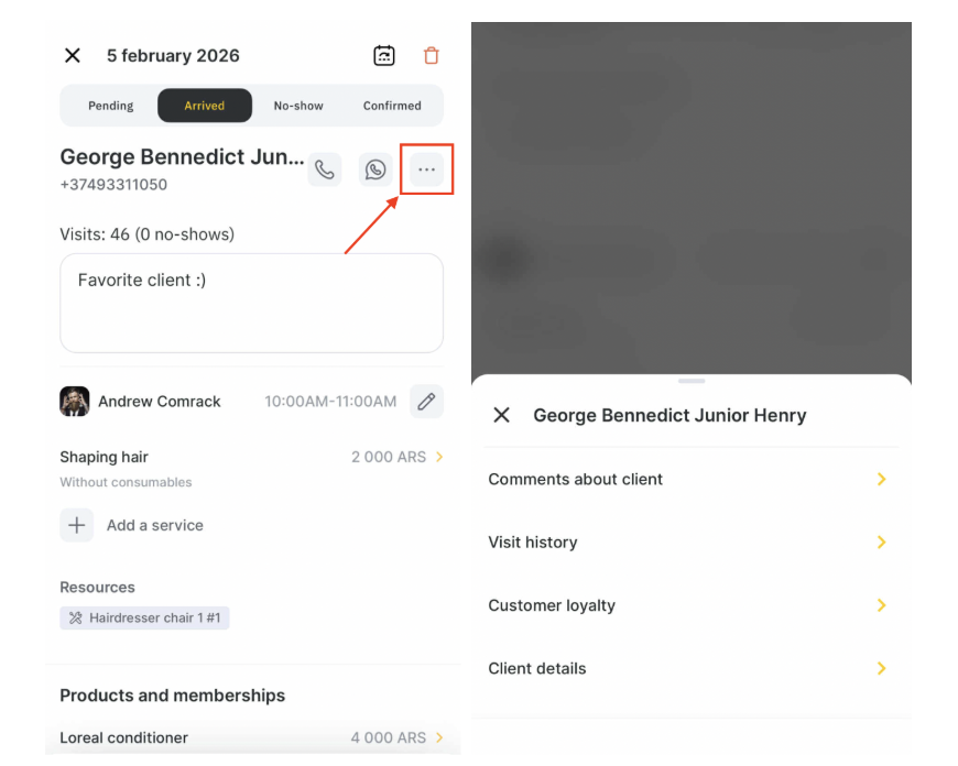 You can make a phone call to the client or contact on WhatsApp (if the client is not registered on it, an error will appear). To view client data, click the button with three dots.
