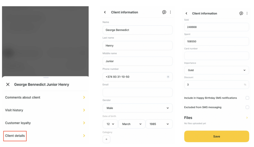 - Client details. Here you can edit the card with the client’s data: name, phone number, Email, gender, date of birth, additional field (if created, you can read more in the article). You can also view the number of visits, how much was sold and paid, the balance (this is the difference between the Sold and Paid values), add the card number, importance class, prediscount and upload files.