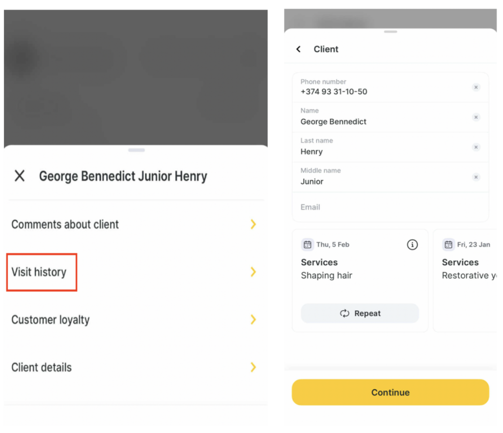 - Select a client. If the client is new, enter their phone number, name, email, and tap Continue. If the client already exists in the client database, select them from the list.