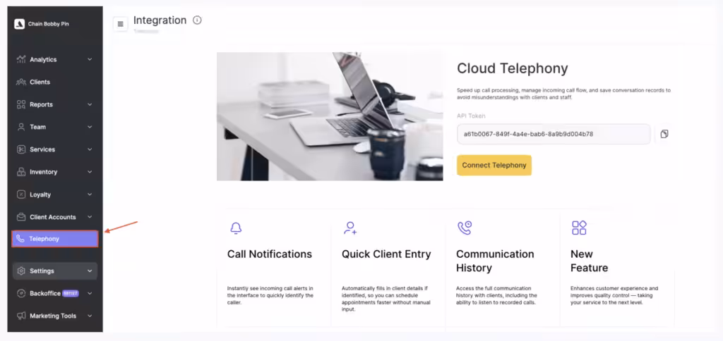 - In the chain interface, go to the Telephony section and copy the telephony token. For detailed instructions on setting up IP telephony in the chain interface, see the article Setting up IP telephony in a chain.