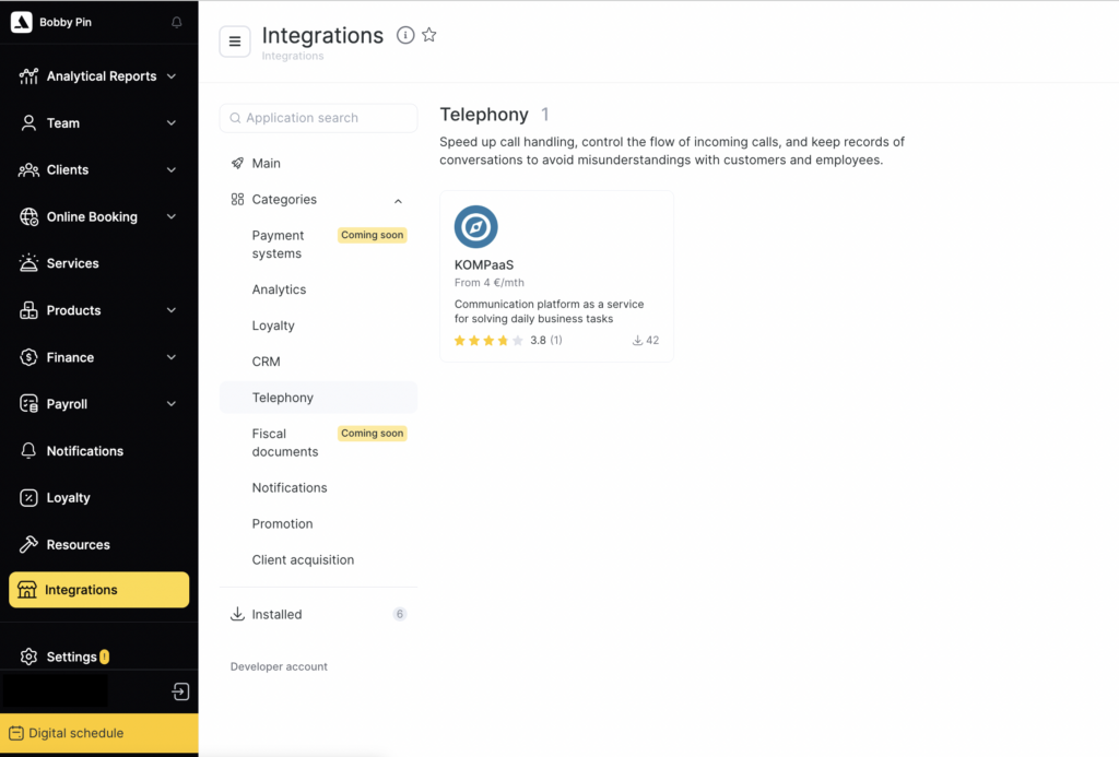 The Altegio and virtual KOMPaaS integration allows you to interact with clients more efficiently by providing convenient call routing with call recording and support for all Altegio services. Notifications about calls received through virtual KOMPaaS are displayed in the Altegio interface, and the client card opens during the call.