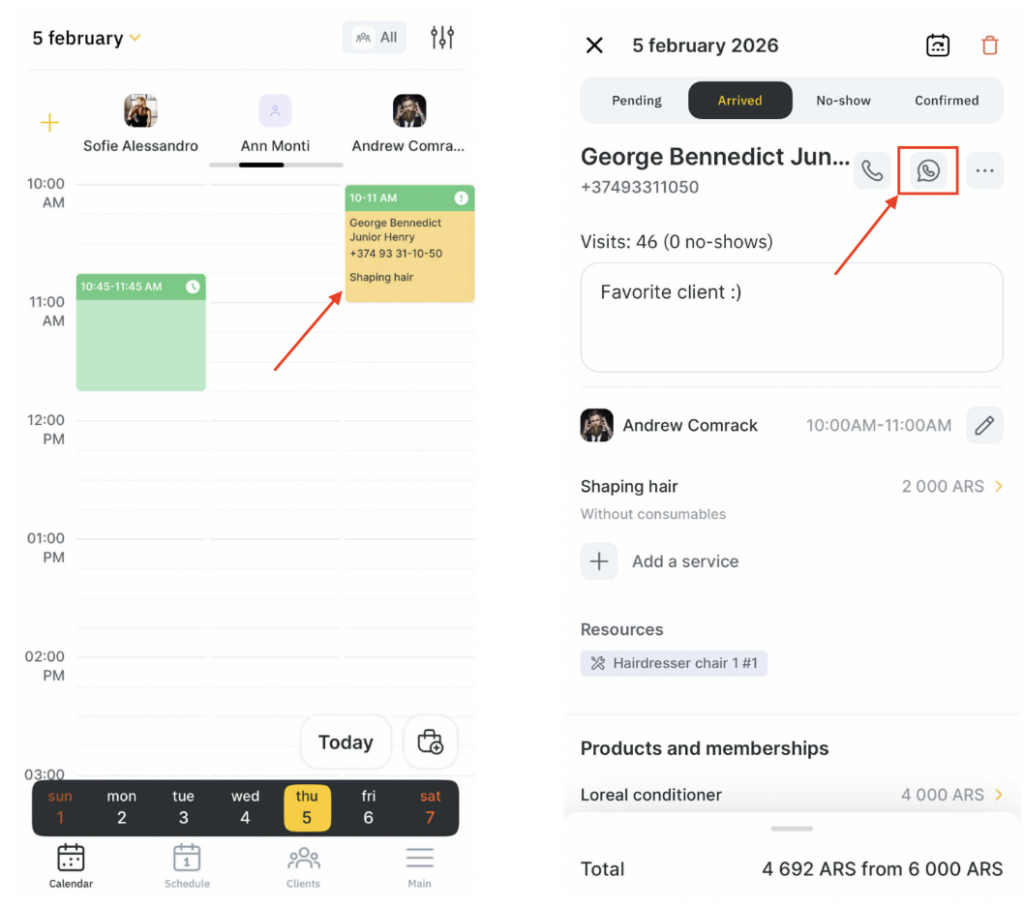 - In the appointment window, tap the WhatsApp icon to the right of the client’s name.