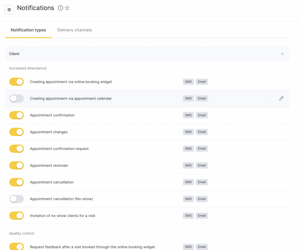 - In the main menu, go to Settings > System settings > Notifications, then open the Notification types tab.