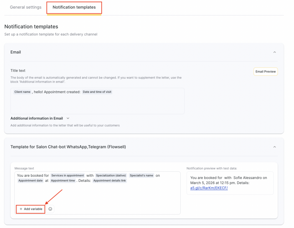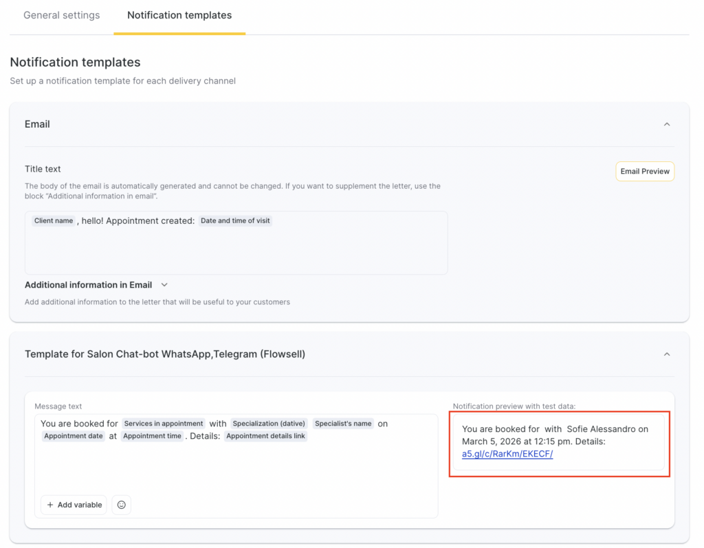 - A preview is available for all notification templates, showing how the message will look when sent to a client, team member, or receptionist with the selected variables.