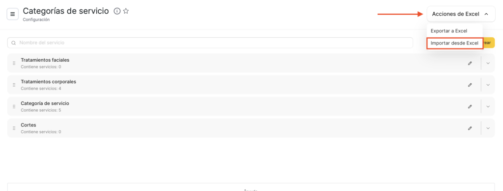 No es necesario crear nuevas categorías con anticipación.Si estás importando servicios en categorías existentes, asegúrate de que los nombres en el sistema y en la tabla coincidan exactamente.