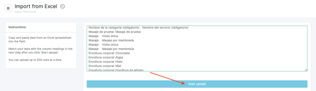 - Pega los datos de la tabla de Excel en el campo de entrada y haz clic en Import. Puedes importar como máximo 500 filas de la tabla por vez.