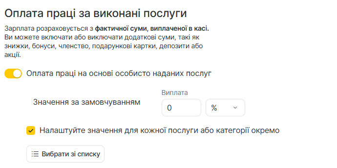 - Увімкніть опцію Виплачувати за особисто надані послуги, якщо співробітник має отримувати винагороду за участь у наданні послуг.