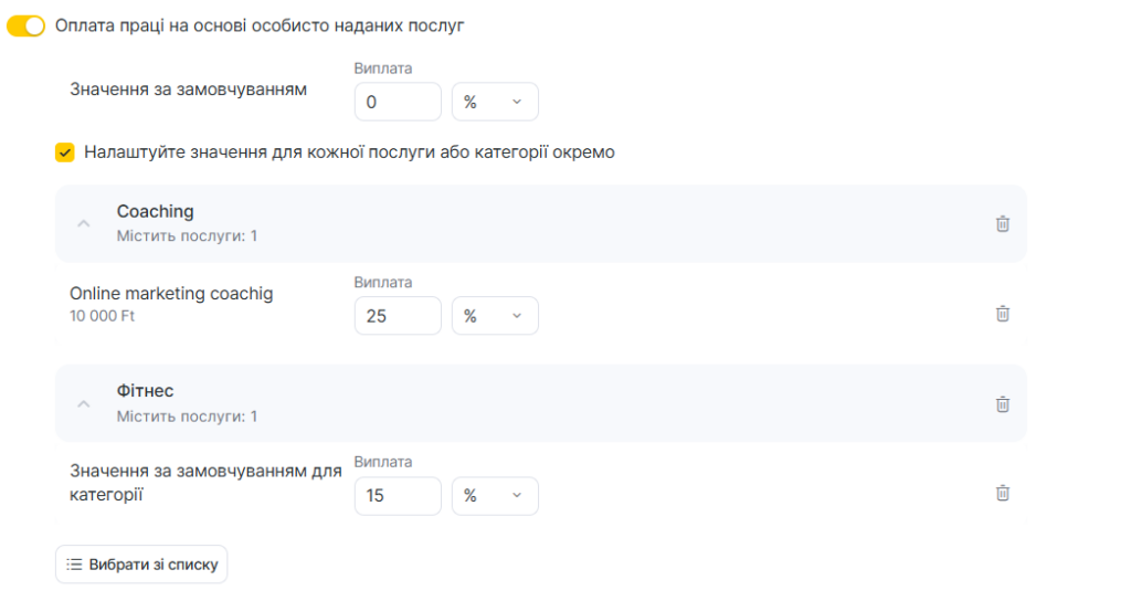 - Встановіть індивідуальні значення для різних послуг або категорій. Щоб вибрати категорії чи послуги, натисніть кнопку Вибрати зі списку.