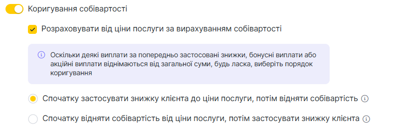 - Якщо увімкнути коригування, заробітна плата розраховуватиметься від повної вартості послуги — без зменшення на знижки клієнта, оплату бонусами, сертифікатами, акціями чи абонементами.