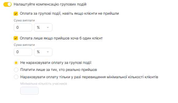 Якщо ваша команда проводить групові сесії (наприклад, тренування або майстер-класи), активуйте налаштування компенсації за групові заходи.
